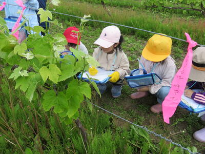 6月11日(火)に、1・2年生が、生活科の学習で、地域の果樹園へ行きました。生涯学習センターの方々を講師に、様々な果物の木を観察し、自分でお気に入りの木を見つけ、スケッチしました。今後、自分のお気に入りの木を観察して、成長を感じていきます。