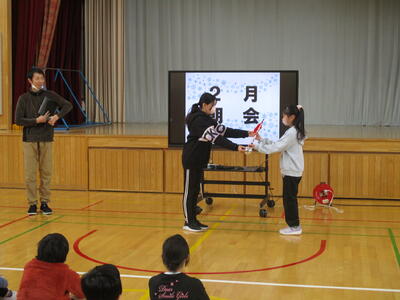 2月1日(木)の全校朝会において、6年中島さんから4年中山さんに指揮杖が手渡されました。新年度からも、在校生たちが山部小の伝統を引き継いでいってくれることを期待しています。