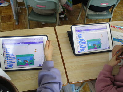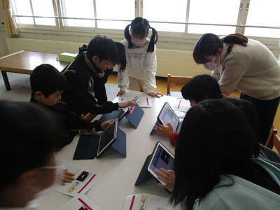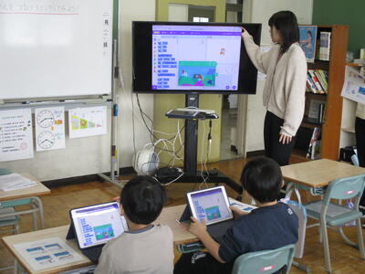 ICT支援員の佐野様、沖永様のご協力のもと、タブレット端末を使ったプログラミング授業を行いました。