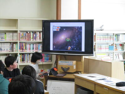 1~2年生は「水族館をつくろう」(20日実施)、3~6年生は「シューティングゲームをつくろう」(21日実施)という内容で取り組みましたが、子ども達は使い方に慣れると、ドンドン自分の力でプログラムを組み立てることできるようになり、それぞれ工夫をこらした作品を完成させていました。